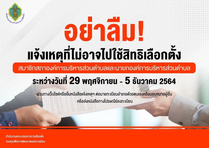 ????ประชาสัมพันธ์ หากผู้มีสิทธิเลือกตั้งไม่สามารถไปใช้สิทธิเลือกตั้งสมาชิกสภา อบต. และ นายก อบต. สามารถแจ้งเหตุที่ไม่อาจไปใช้สิทธิเลือกตั้ง โดยให้ยื่นหนังสือด้วยตัวเอง หรือมอบหมายให้ผู้อื่นยื่นแทน หรือจัดส่งทางไปรษณีย์ลงทะเบียน หรือแจ้งผ่านทางระบบอิเล็กทรอนิกส์ ภายใน 7 วันหลังวันเลือกตั้ง