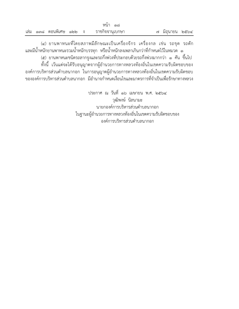 ประกาศผู้อำนวยการทางหลวงท้องถิ่น เรื่อง ห้ามใช้ยานพาหนะที่มีน้ำหนัก น้ำหนักบรรทุก หรือน้ำหนักลงเพลาเกินกว่าที่ได้กำหนด หรือโดยที่ยานพาหนะนั้นอาจทำให้ทางหลวงเสียหายเดินบนทางหลวงท้องถิ่น ในเขตความรับผิดชอบขององค์การบริหารส่วนตำบลนากอก |