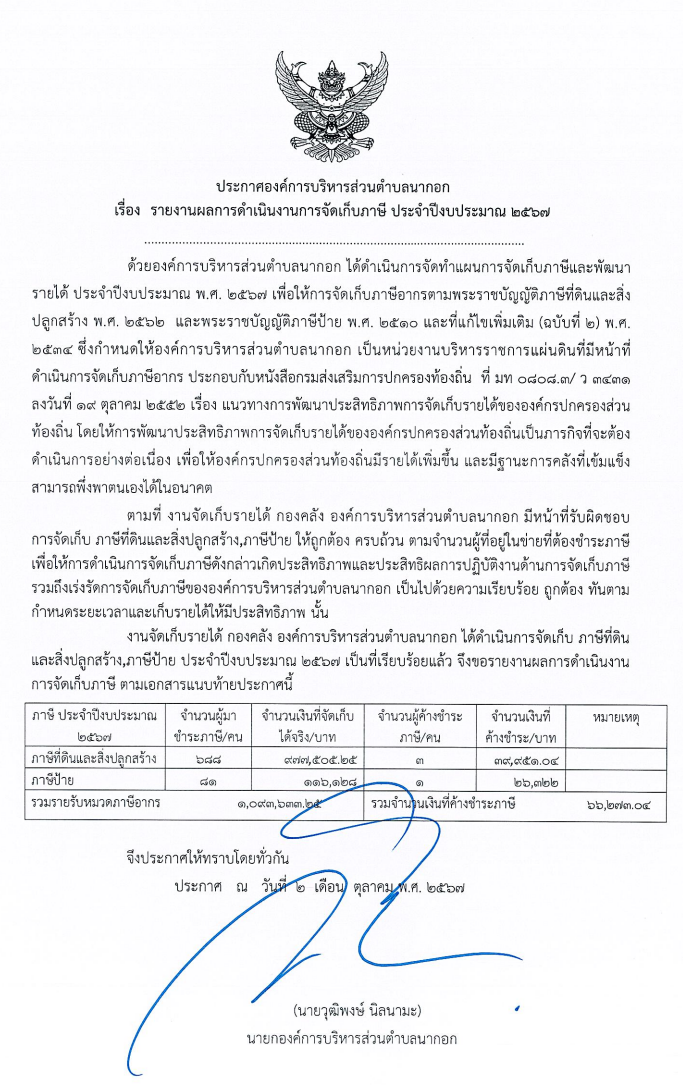 ประกาศรายงานผลการดำเนินงานการจัดเก็บภาษี ประจำปีงบประมาณ 2567
