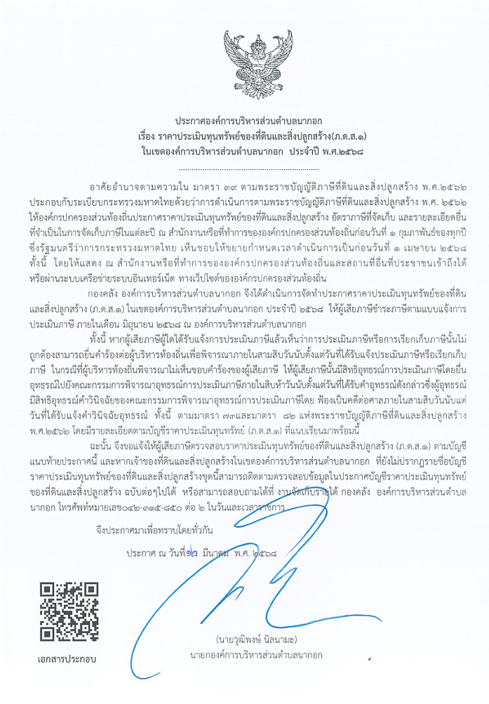 ประกาศราคาประเมินทุนทรัพย์ของที่ดินและสิ่งปลูกสร้าง (ภ.ด.ส.1) ประจำปี 2568
