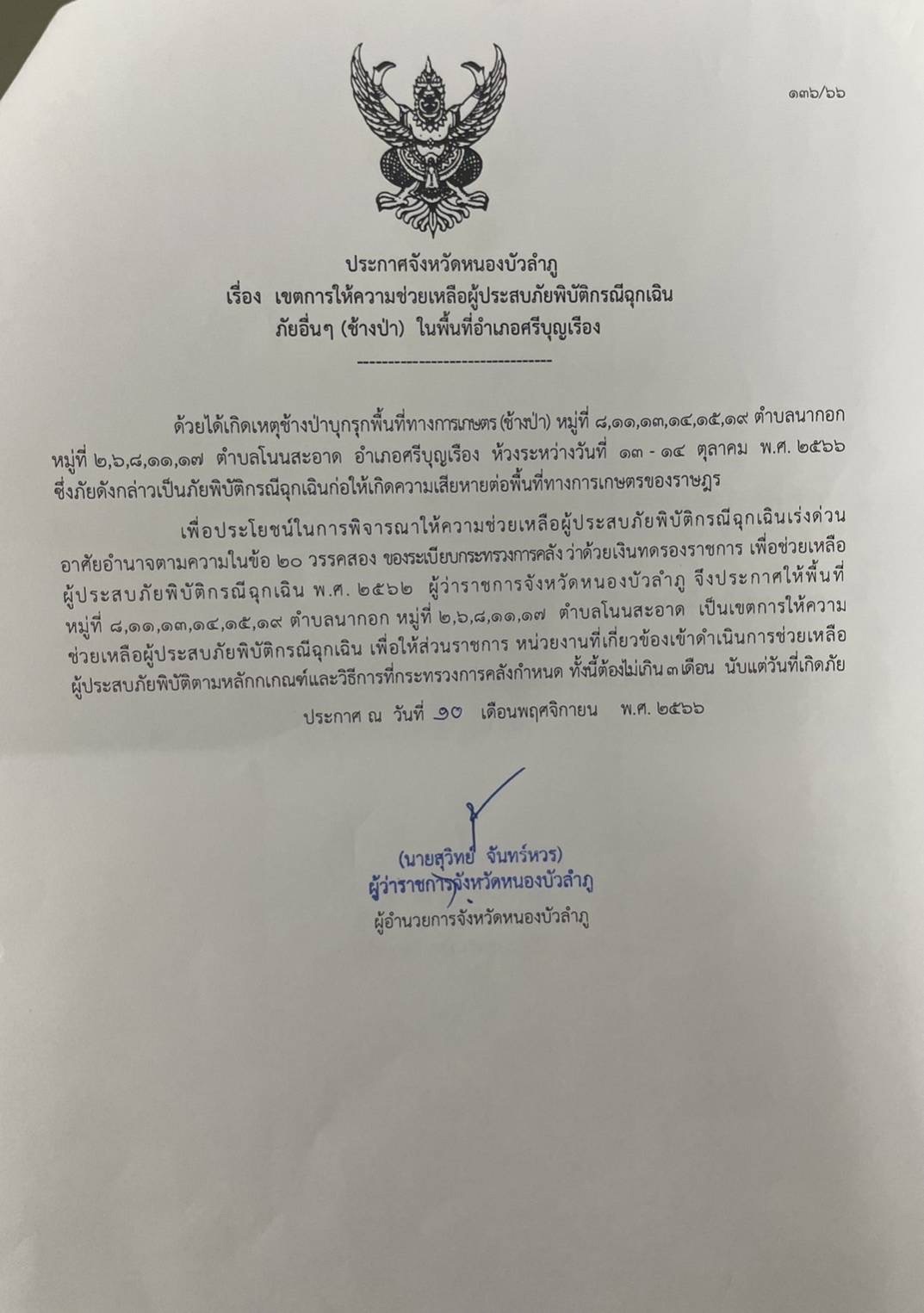 ประกาศพื้นที่ภัยพิบัติจากช้างป่า ตำบลนากอก และตำบลโนนสะอาด