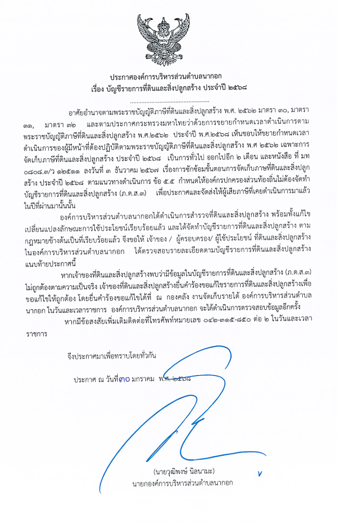 ประกาศบัญชีรายการที่ดินและสิ่งปลูกสร้าง ประจำปี 2568
